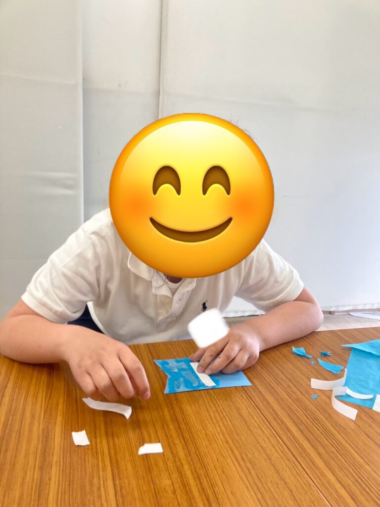 細かくちぎって貼る子、大きくちぎったり、ねじって貼りつける子など指先をしっかり使って思い思いにオリジナルの鯉のぼりを完成させています🎏