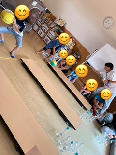お楽しみ会では、ボーリング大会をしました。少し水を入れたペットボトルのピンを10本、ボールを投げて倒します。周りの応援を受けて、2投で何本倒せるか!!