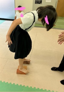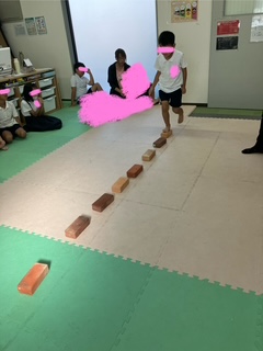 集団活動は、「ブロック歩行に挑戦」❣ブロックの上をバランスを取りながら歩いて行きます。