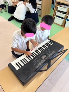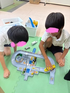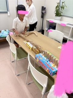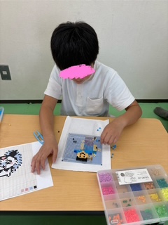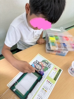 自由遊びの様子です。ジェンガで長いドミノを作ったり、アイロンビーズをしたり、それぞれ楽しく遊んでいますよ♫