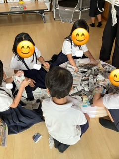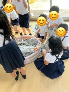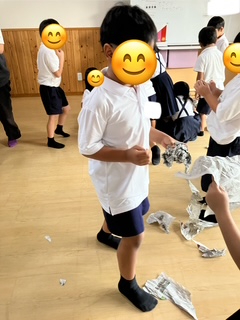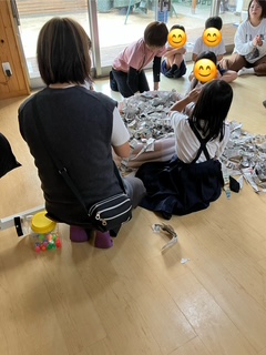 集団活動では、新聞紙をびりびりに破り、その中からボールを見つけるという、宝探しをしました!🤫