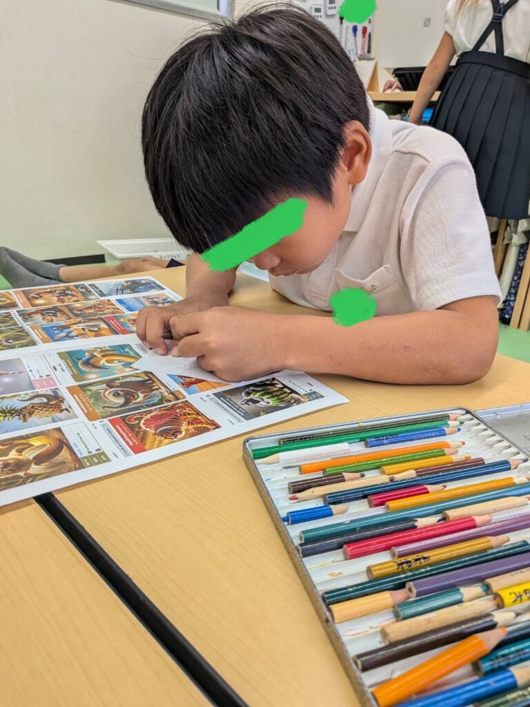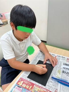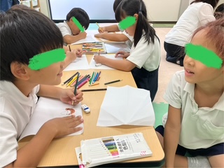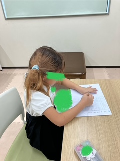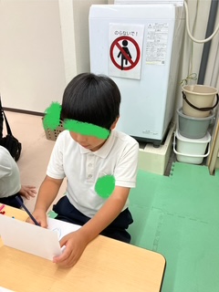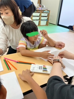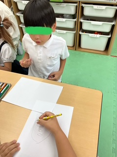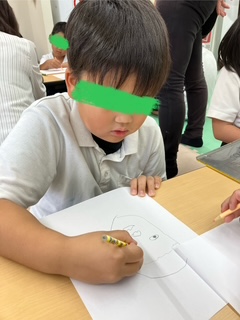 苦手なお友だちは最初は不安そうな表情でしたが、向かい合わせのお友だちが描き始めるとその子も描き始めていて自信になったようです(^^♪