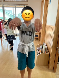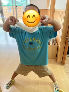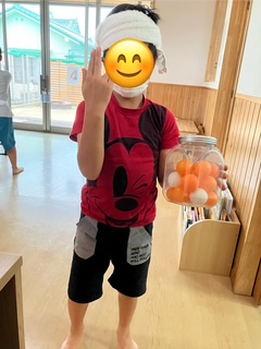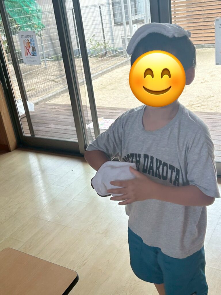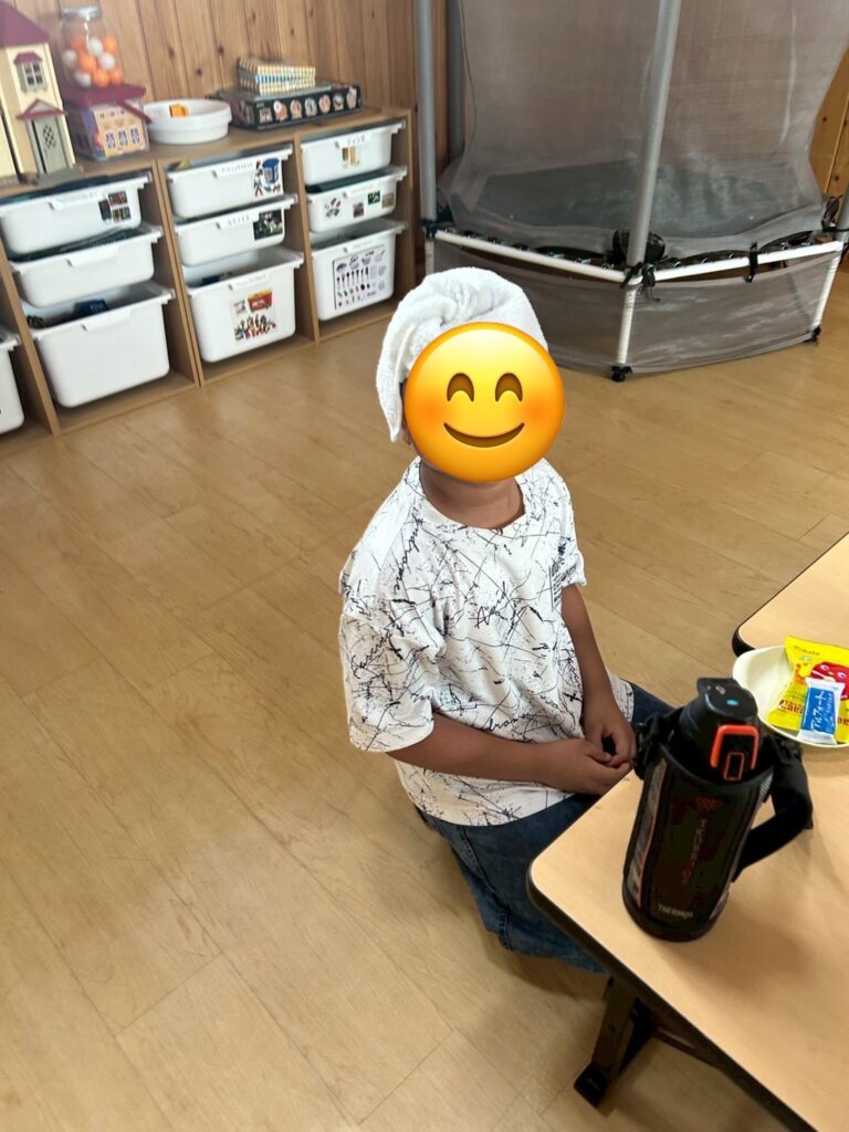 おやつを食べ終えてもいろんなタオルの巻き方で遊んでいました!👳🏻♂️