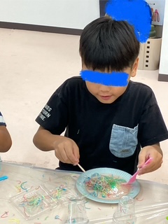 普段は食材の(はるさめ)です。食紅で色をつけて赤・黄色・緑・青などのお湯で茹でた状態の春雨を見ると子どもたちは興味津々でした😲
