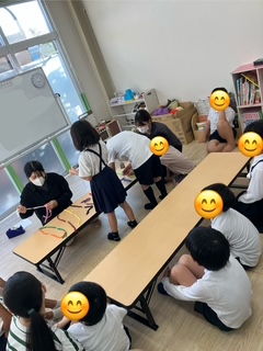 残りの1つは、「お月様には、どんな生き物がいるって言われているかな」とヒントを出すと一斉に「ウサギ!」と答えてくれ、その後に「他の所だと、違う生き物に見えるんよ!」とお友だちに教えてあげている子もいましたよ😊