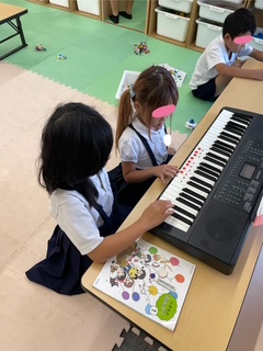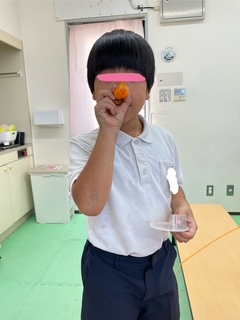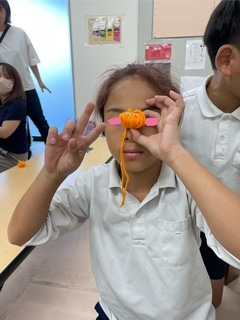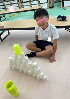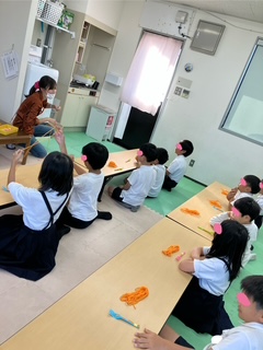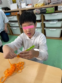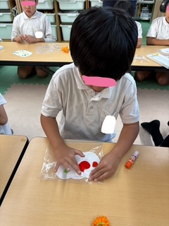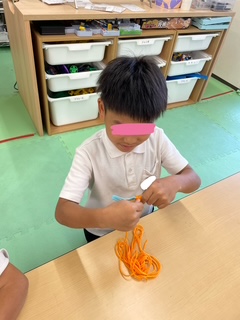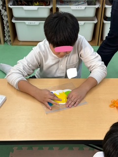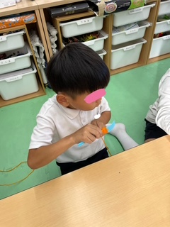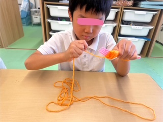 これは、指先をを使う活動です。指先を使うことで脳に刺激を与え、様々な能力を向上させることができます。また、指先を使った活動は、目と手の協応運動に役立ったり集中力を高める事が出来ます。