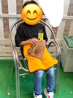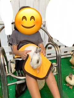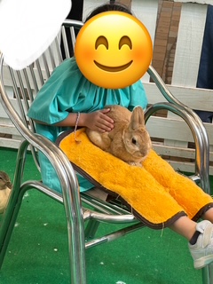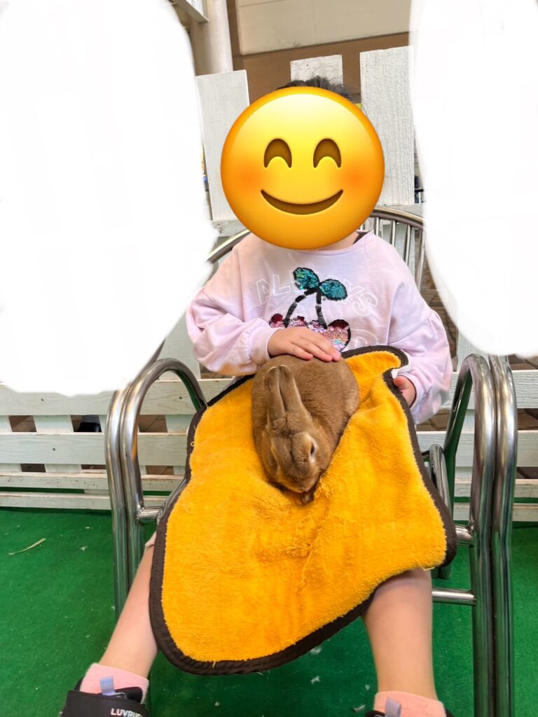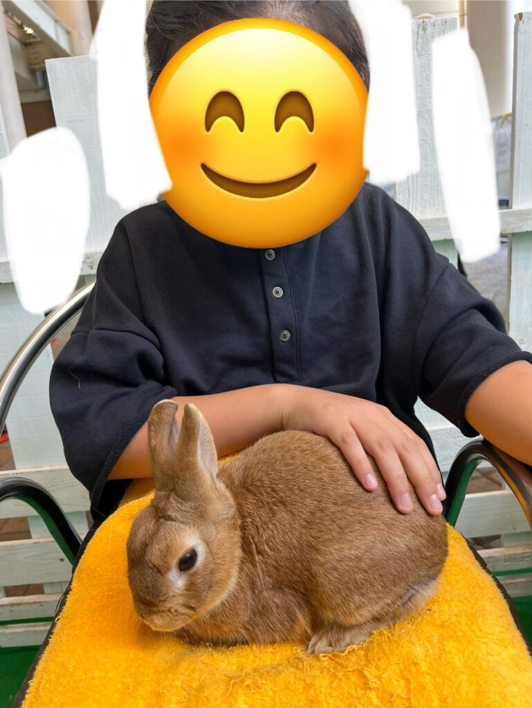 ウサギを膝に乗せて撫でる子🐰