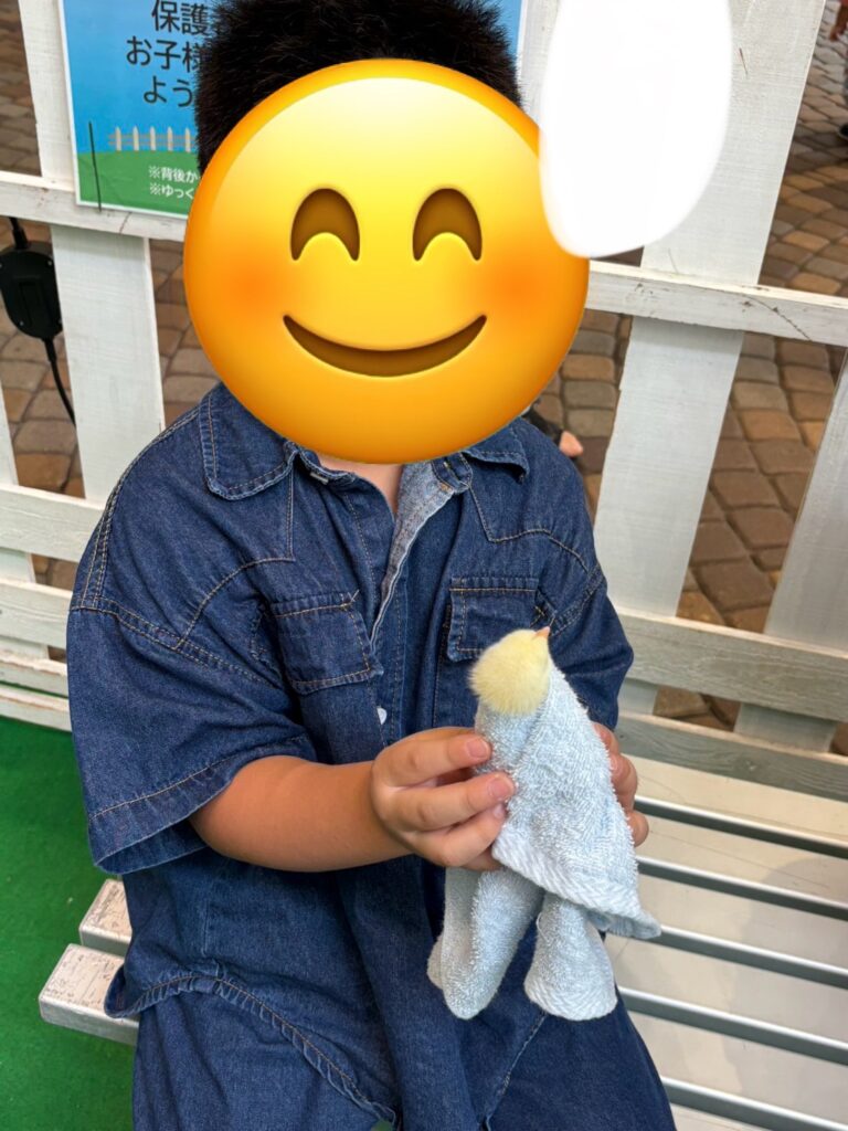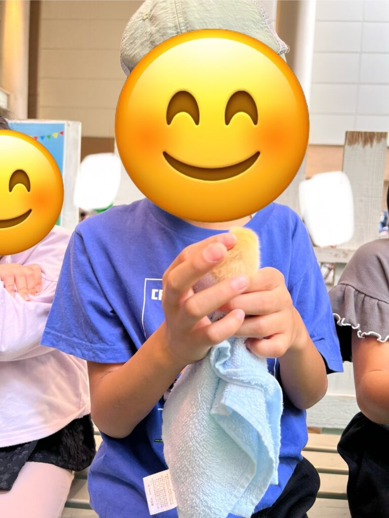 小さなヒヨコをそっと触って楽しむ子🐣