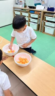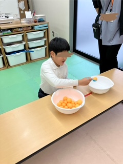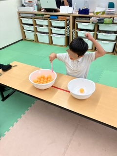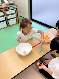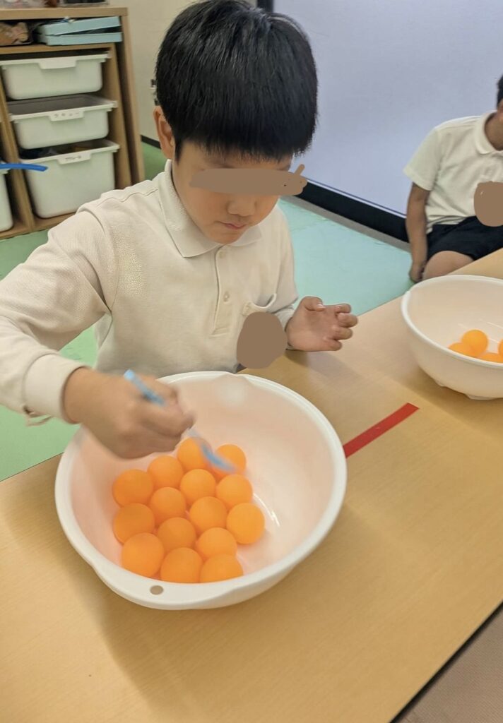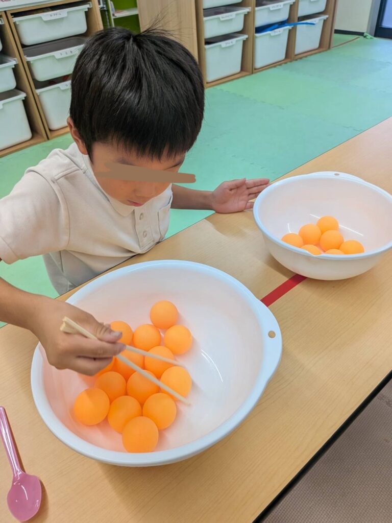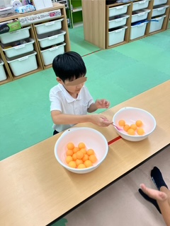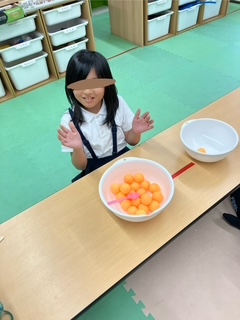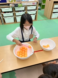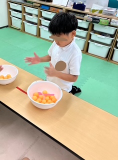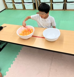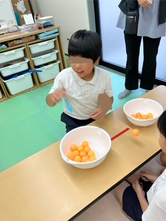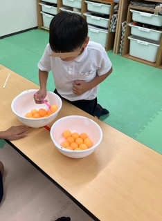 集団活動では音楽に合わせて身体を動かしながら、ピンポン玉をボールからボールへ移すゲームをしました!