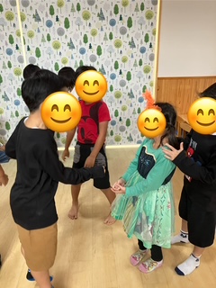 朝の会で、午後からの流れの説明と、ハロウィンて何?という話や、お店での約束、さらに、じゃんけん列車をしました。