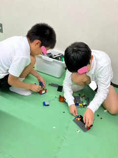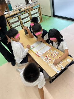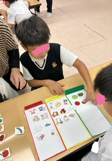 こちらのチームは、全員で話し合うタイプです。「豆腐は大豆から出来ているから赤だよ」「確かに。そうだね」と子どもたち同士で意見を出し合い、考えて分類していました。話し合いに夢中でヒントには気づいていませんでした😙