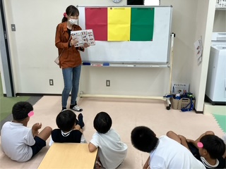 「3色食品群って知ってる?」の問いかけに「知ってるよ!体を作ったり力になったり、イイうんちがでるやつ。」「赤、黄色、緑のやつね」と次々に応える子どもたち!