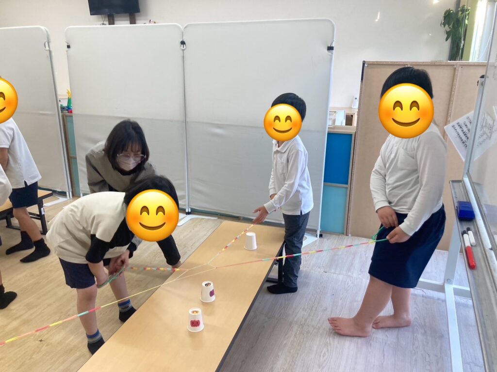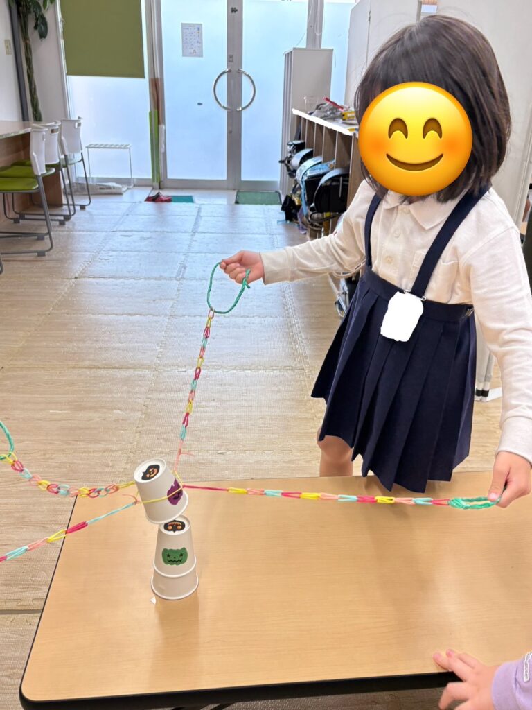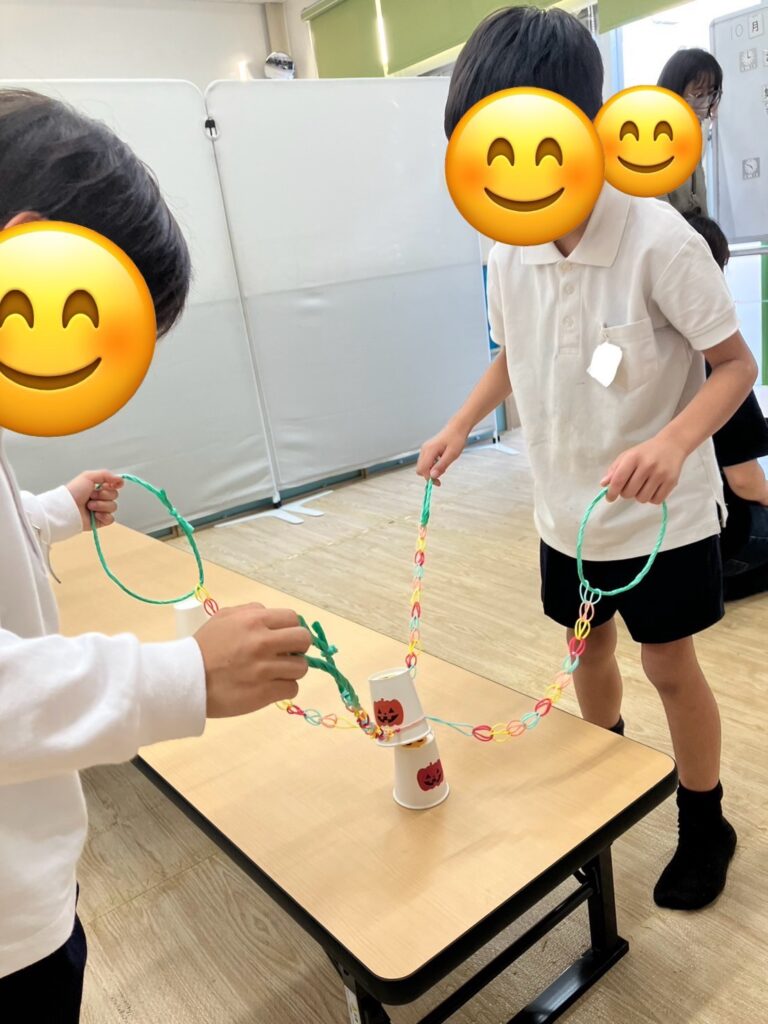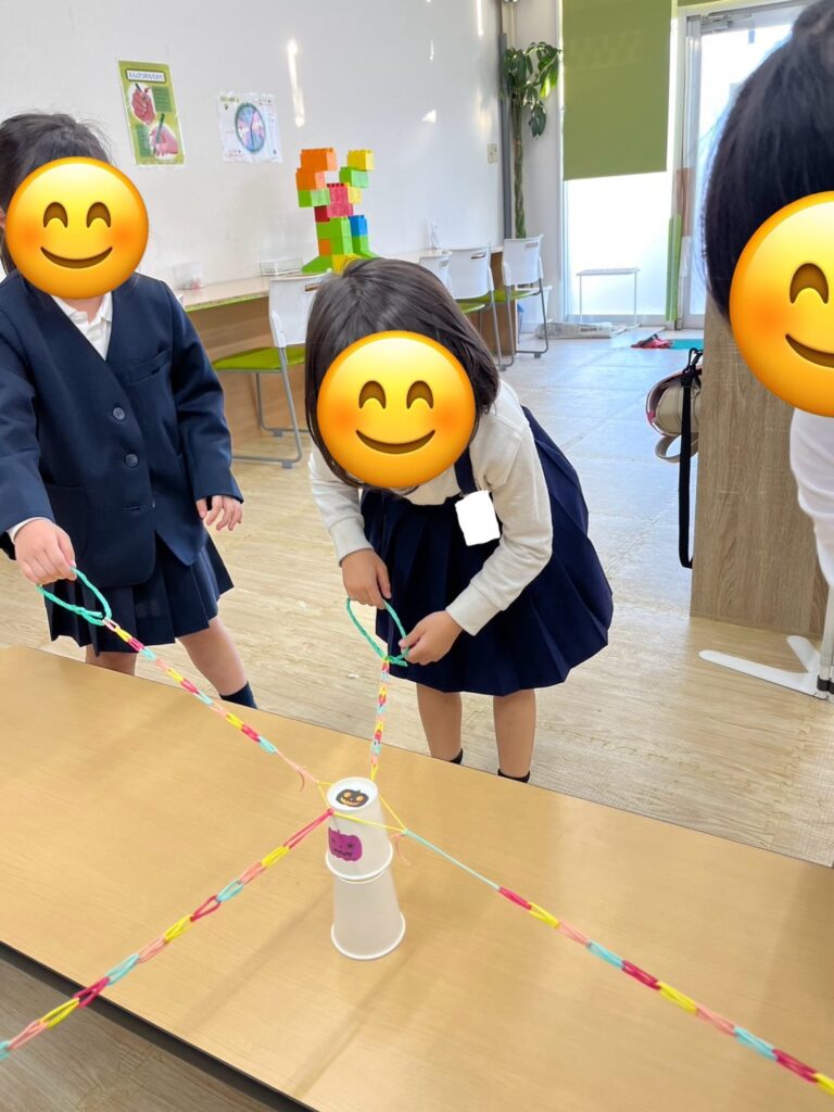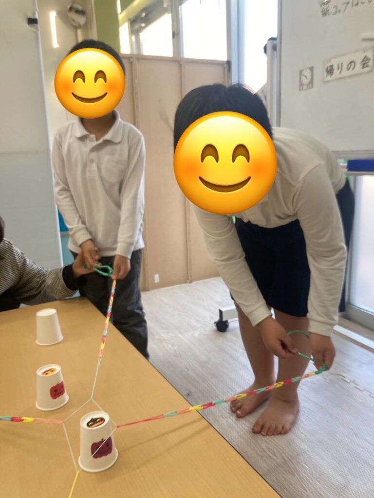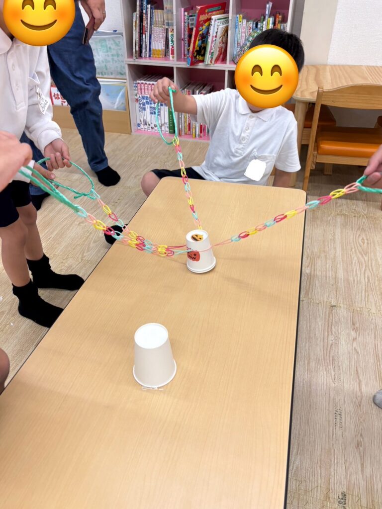 この活動は輪ゴムを紐のようにし、4本作り、4人1組でその紐を一人ずつ持ち、4人で協力して一つのコップを挟んでゴールのコップに重ねていきます🥛