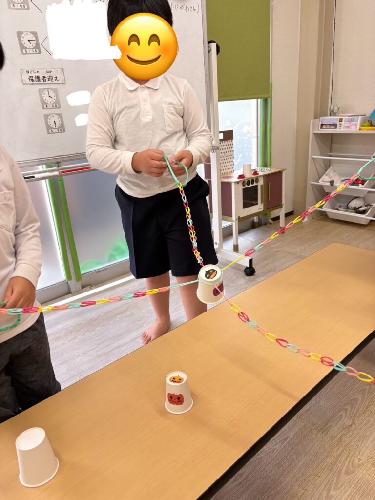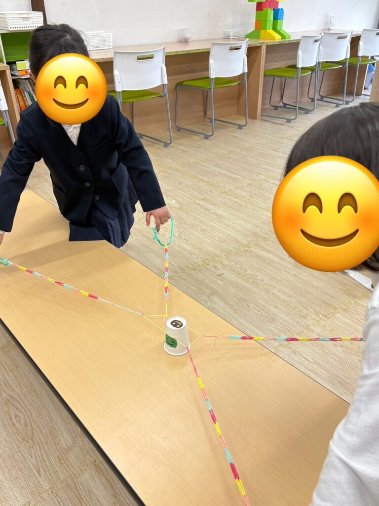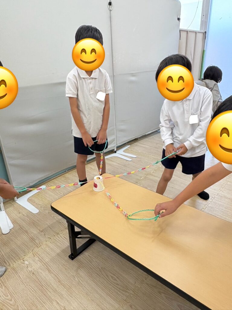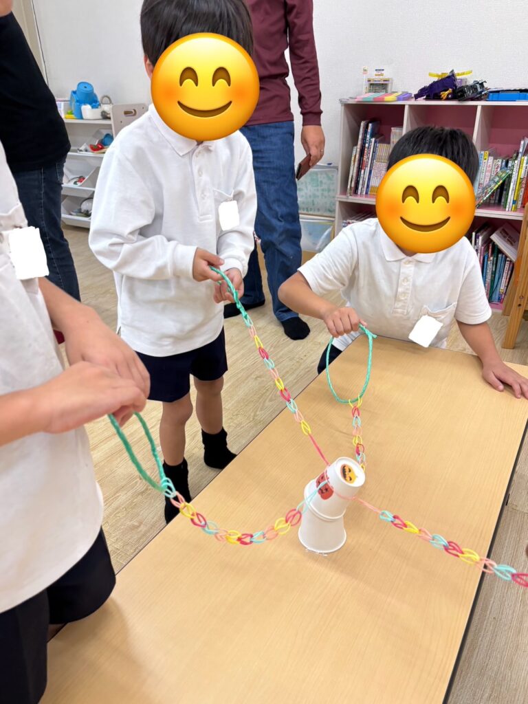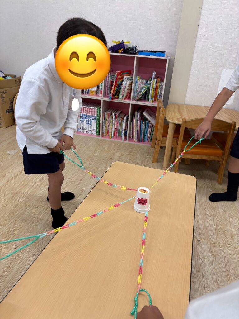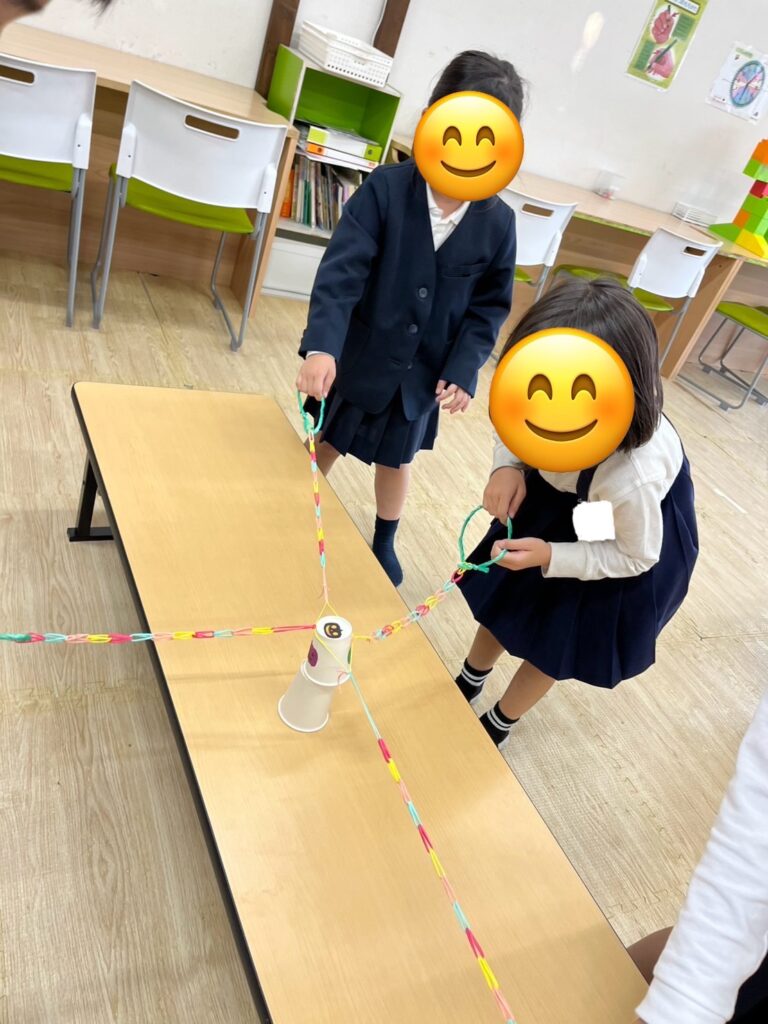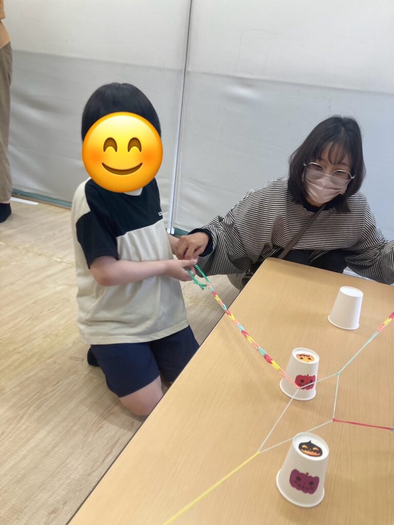 この活動は輪ゴムを紐のようにし、4本作り、4人1組でその紐を一人ずつ持ち、4人で協力して一つのコップを挟んでゴールのコップに重ねていきます🥛