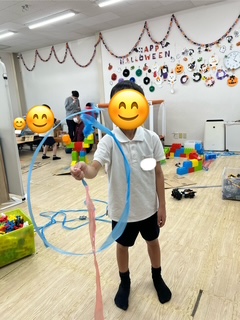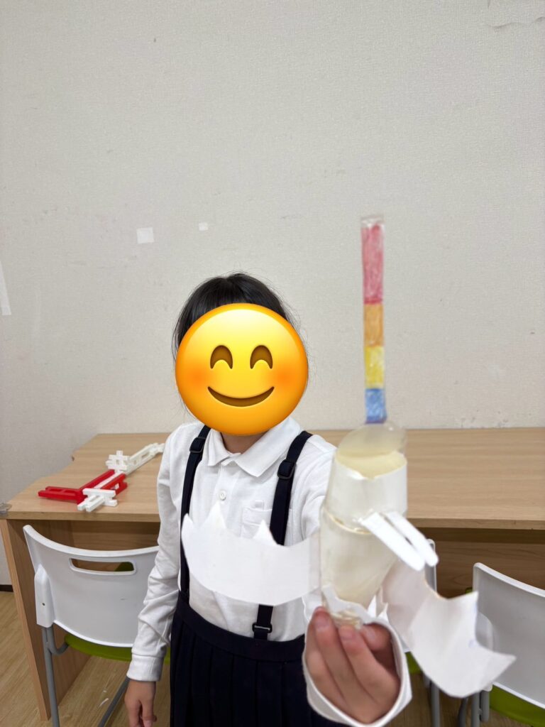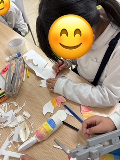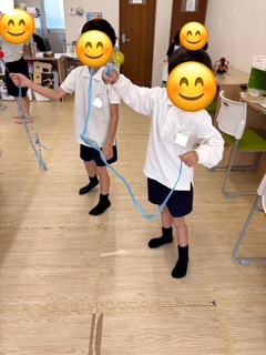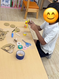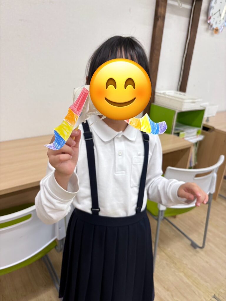 自分たちで考えて紙コップを使ってレインボードラゴンやダンボールで釣りのリール作り、ヒモを使って新体操のリボンを作りました😊