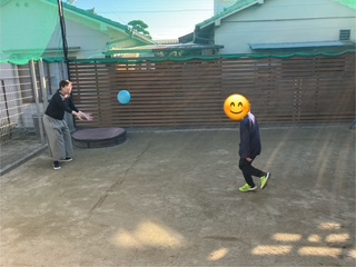 風船をつけた紐を固定させた棒に回し、自分の所からぐるぐる回し、2回手繰り寄せるゲームでした(^_-)-☆