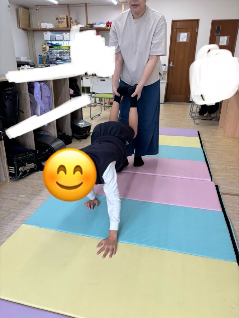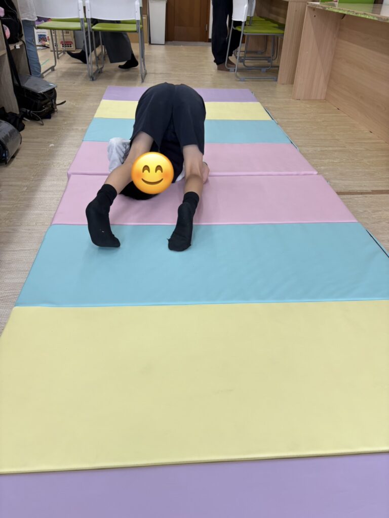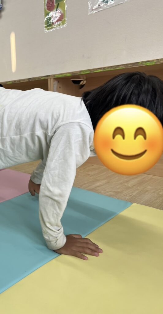 手押し車をしたり、ブリッジをしたり、前転後転をしたり。全身を動かすことを楽しみ、バランス感覚を養ったり、体の使い方を知ったりすることがねらいです。手押し車は、マットの端までいくとそのまま方向転換、行ったり来たりをがんばりました😊
