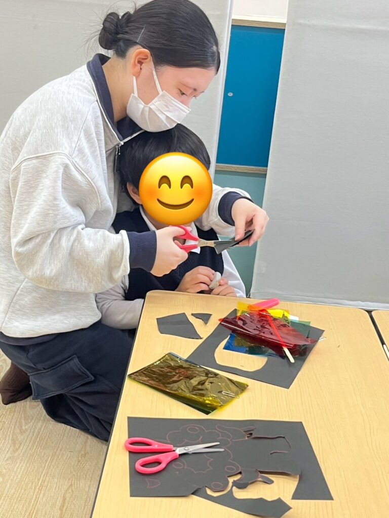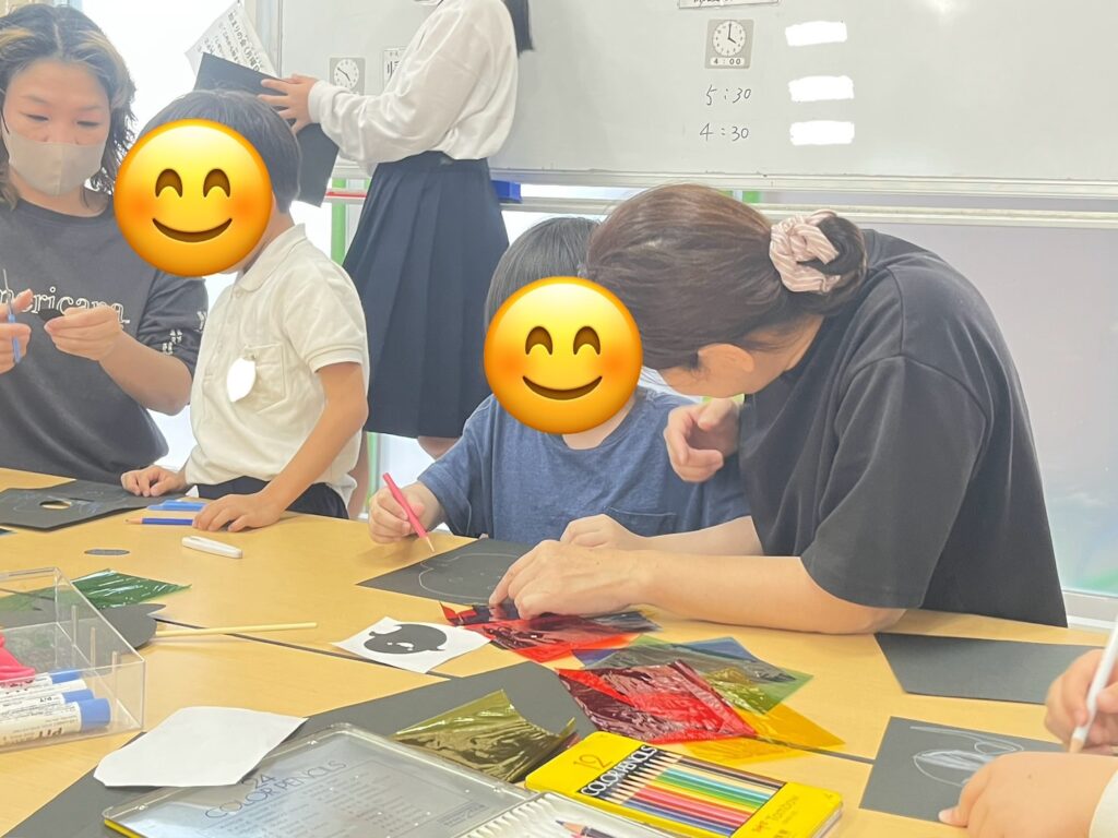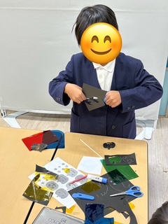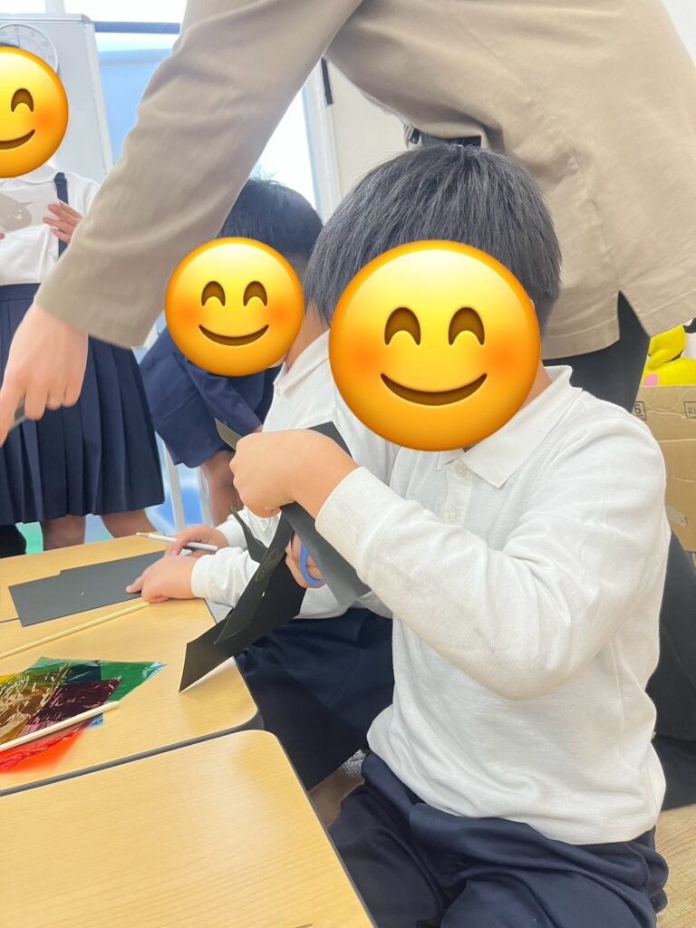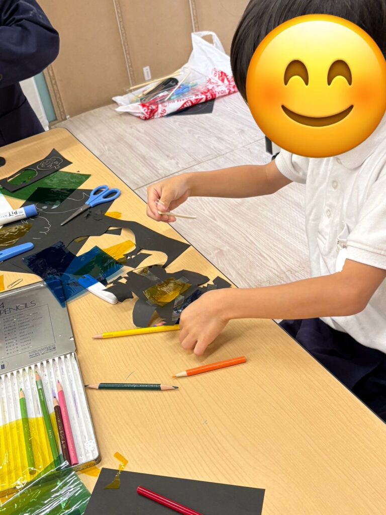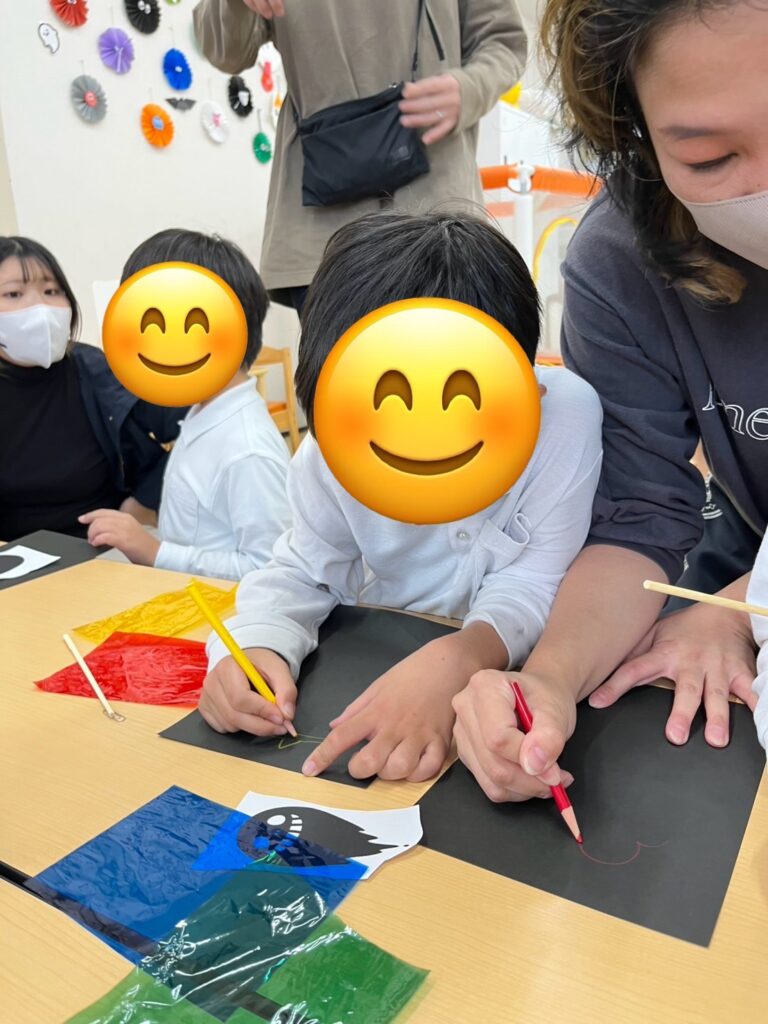 黒の画用紙に色鉛筆で下書きし、好きなおばけを切り抜き、目や口をセロハンでつけていきます。