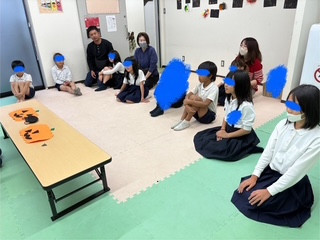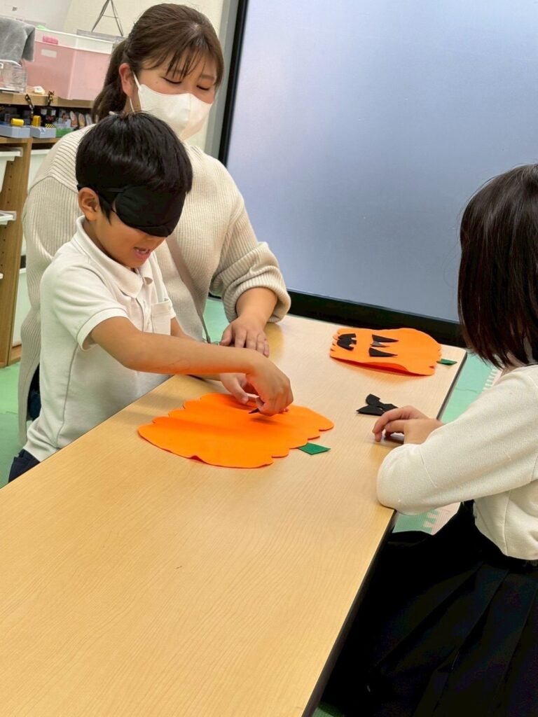 目隠しをして順番に「目」「鼻」「口」の場所を貼り、オリジナルのかぼちゃの顔を完成させます。