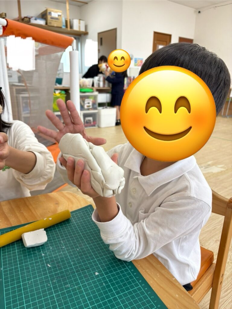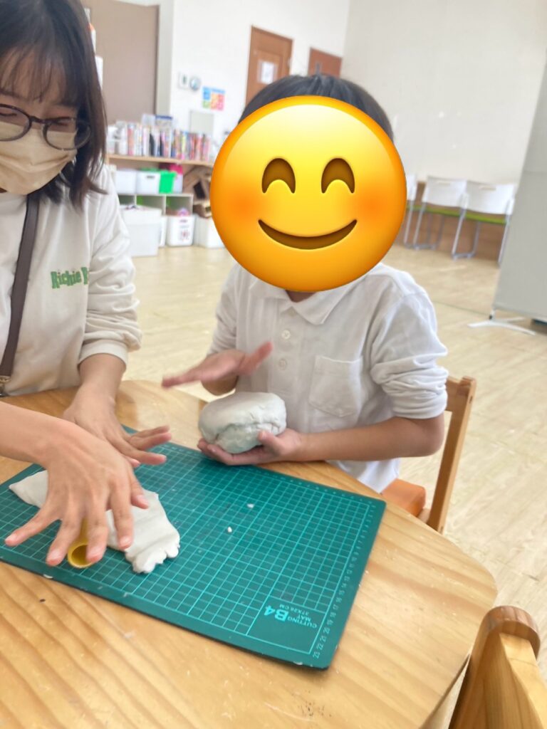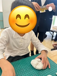 硬い粘土を道具を使って細かく切ったあとは、手でしっかり丸めて捏ねたりしながら柔らかくしました。