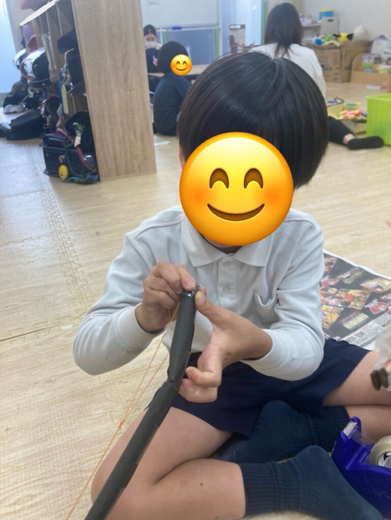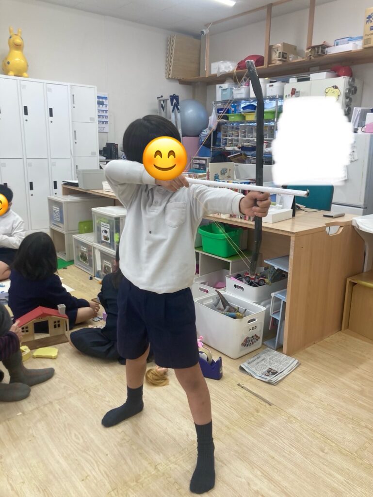 工作をしていた子は、輪ゴムや画用紙を使って弓と矢を作っていました🏹