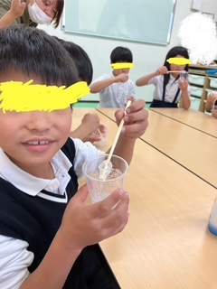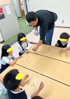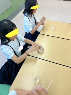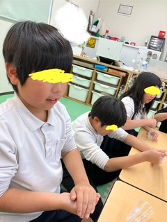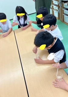 集団活動はスライムを作りました♫洗濯糊に重曹を入れるチームとホウ砂を入れるチームに分かれて作りました。重曹チームはなかなか固まらず「え~何で~!」の声も上がりましたが、ホウ砂を入れるとすぐに固まりました。こねていくうちにどんどん固まっていき子どもたちは大喜び!!スライムの感触を楽しみましたよ💛