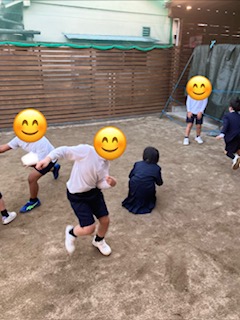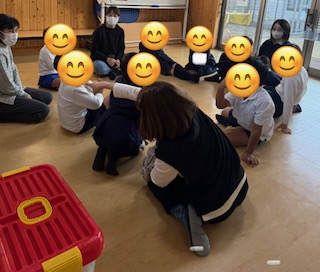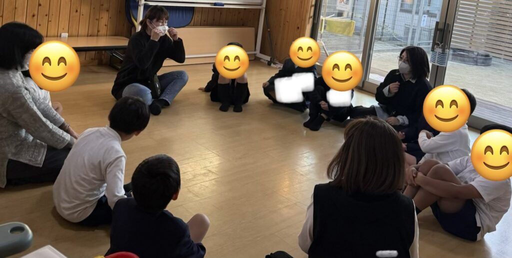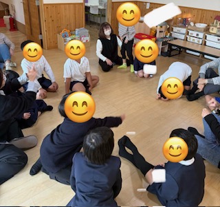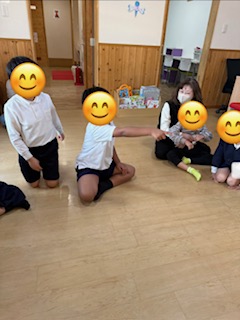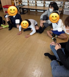 というルールです。テンポを良くしていき楽しむゲームですが、個人的に、「ワンワン!」と鳴きまねをする子どもたちの様子が、とても可愛く感じ、子どもたちも、ワンワン!と言いたい子がたくさんいました。ときたま、「にゃーお🐈」と、猫の声も聞こえて、その度に、笑い声も響き、ほのぼのとした時間でした。