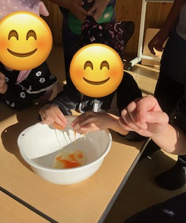 まずは朝の会で卵を割る人、牛乳を量る人など担当を決めて、その後にクッキングでの注意を話し合いました!