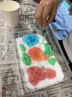 色水が泡になってシュワシュワするのを見て、びっくり・わくわくを共有しました🌟