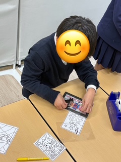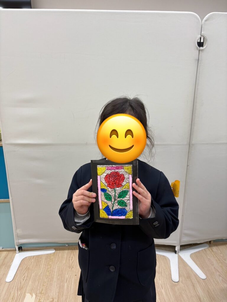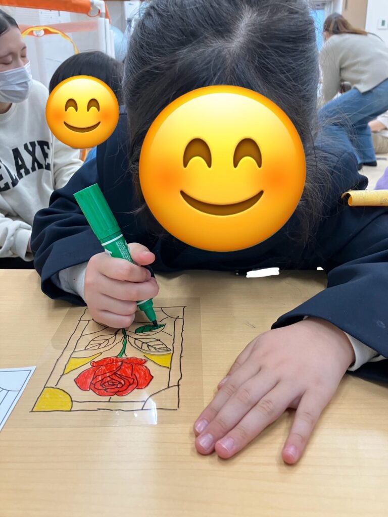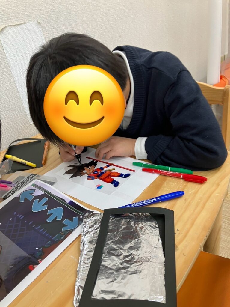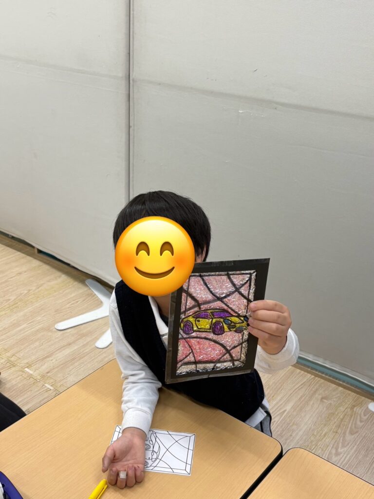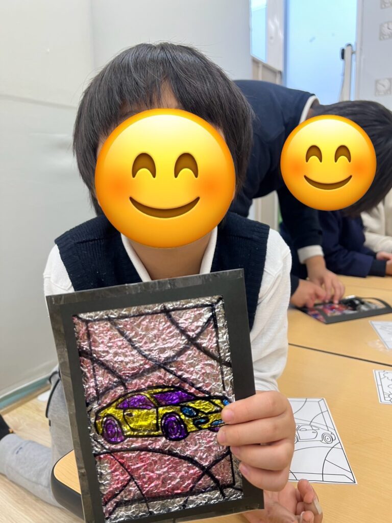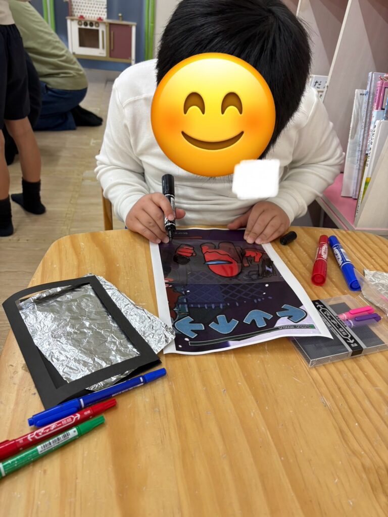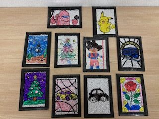 プラ板に好きな絵を描き、色を塗っていきます。黒の画用紙にくしゃくしゃにしたアルミホイルを敷き、その上にプラ板の絵を枠にはめて自分だけのステンドガラスを完成させていきます🖼️