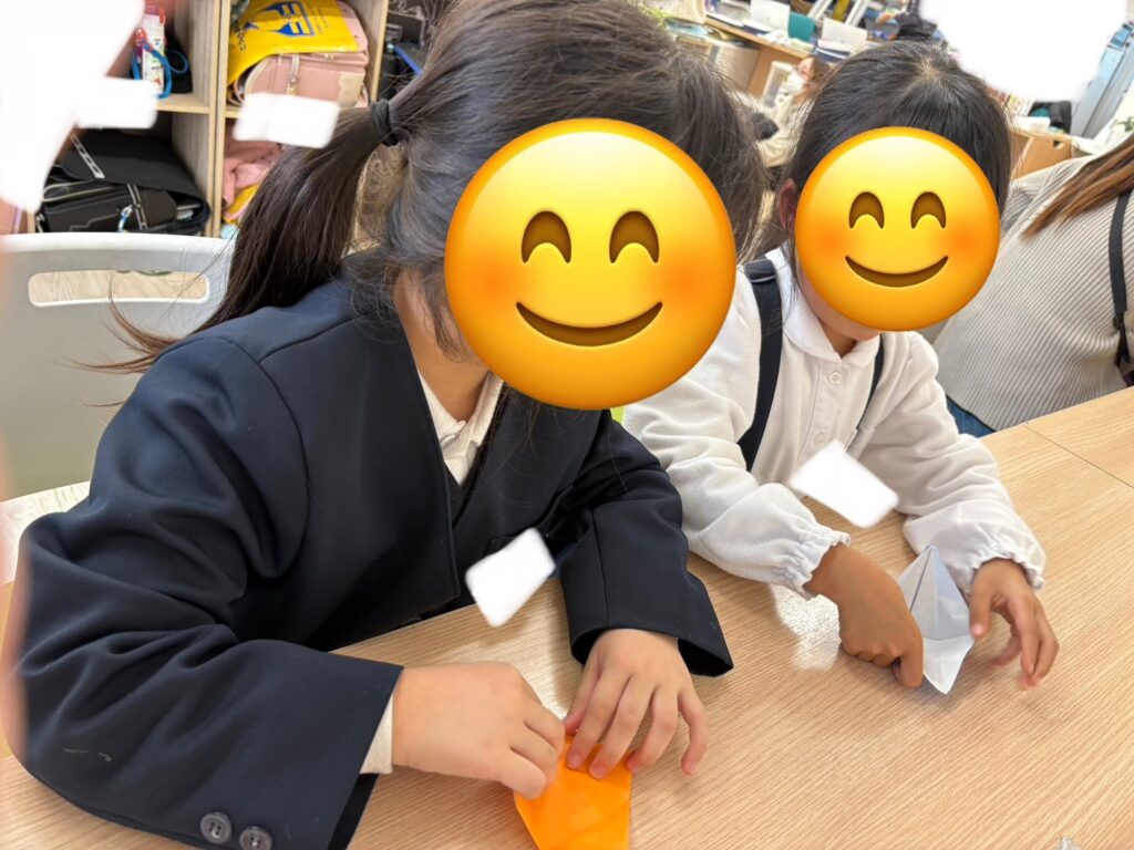 折り紙でパタパタ折り鶴を「友だちにあげるんだよ!」と言いながらスタッフや友だちにも折り方を教えてくれています。