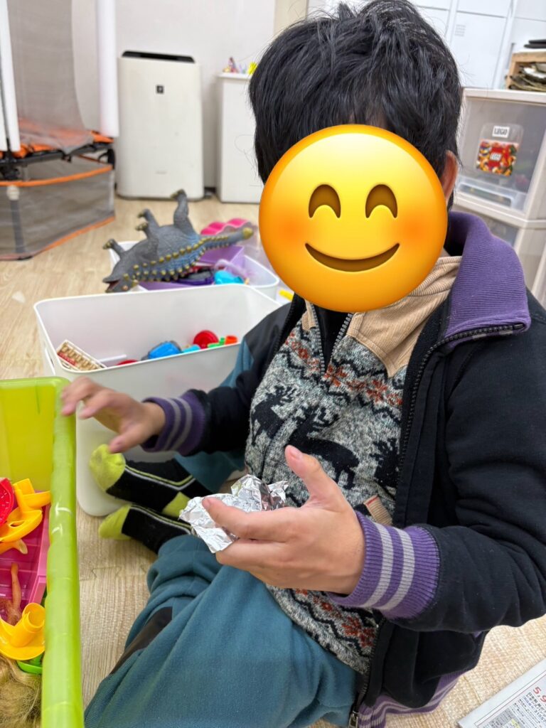 ・アルミホイルをくしゃくしゃにして広げ、貼ったり、色を塗るなどの作業を通して手先の巧緻性を高 めます。