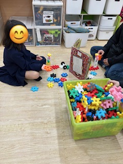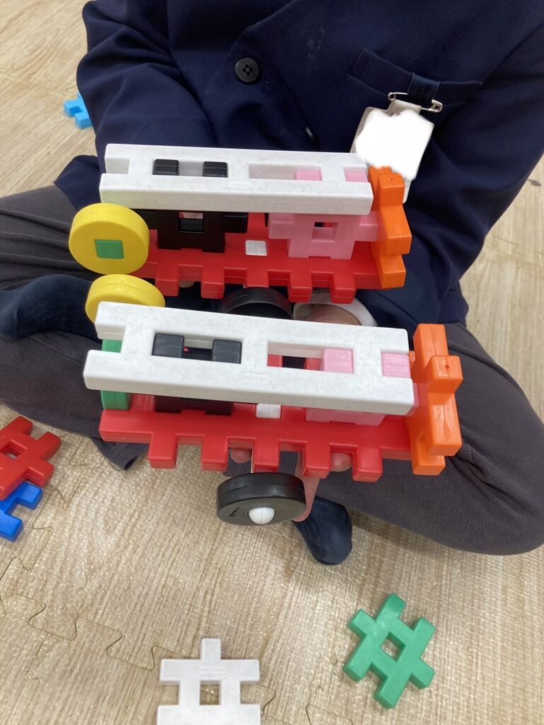 2人1組になり、相手に見えないようにブロックを積みながら指示を出すゲームです。「黄色のブロックをを赤い四角の右側に付けてね」など、色や形、位置を言葉だけで伝えます!最後にブロックを見比べて同じ形ができていたら成功!楽しみながら、伝える力・聞く力が自然と育っていました✨