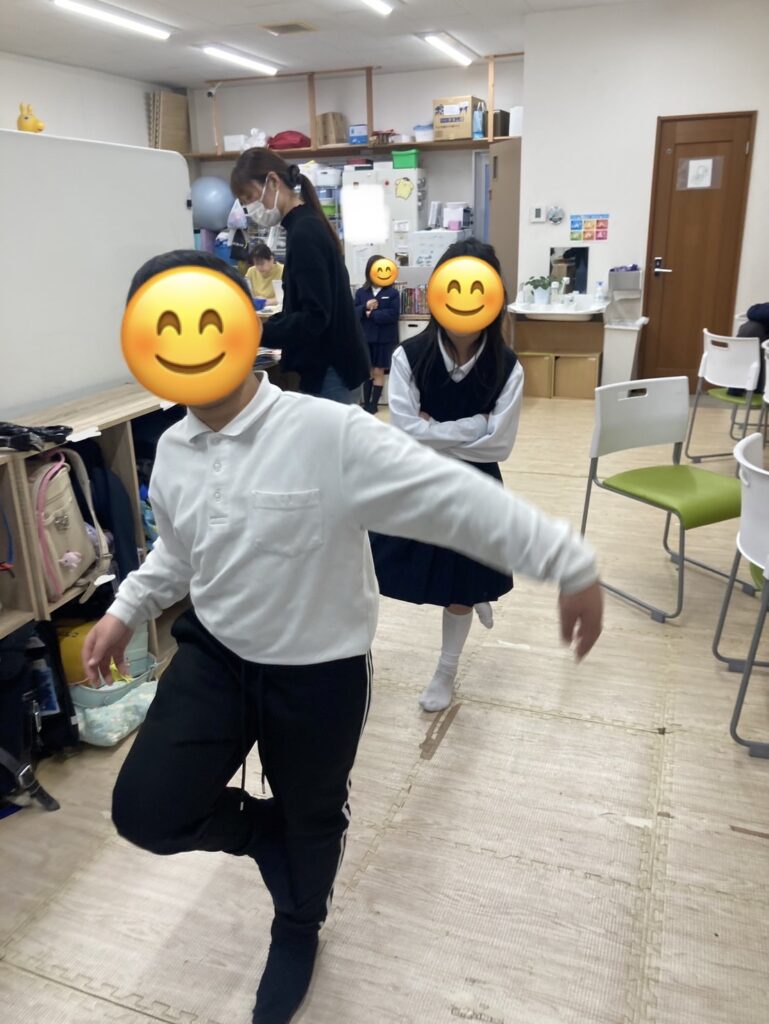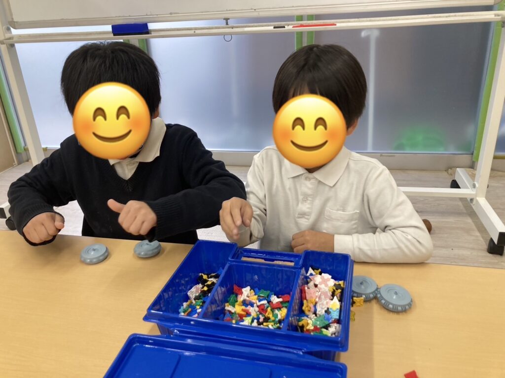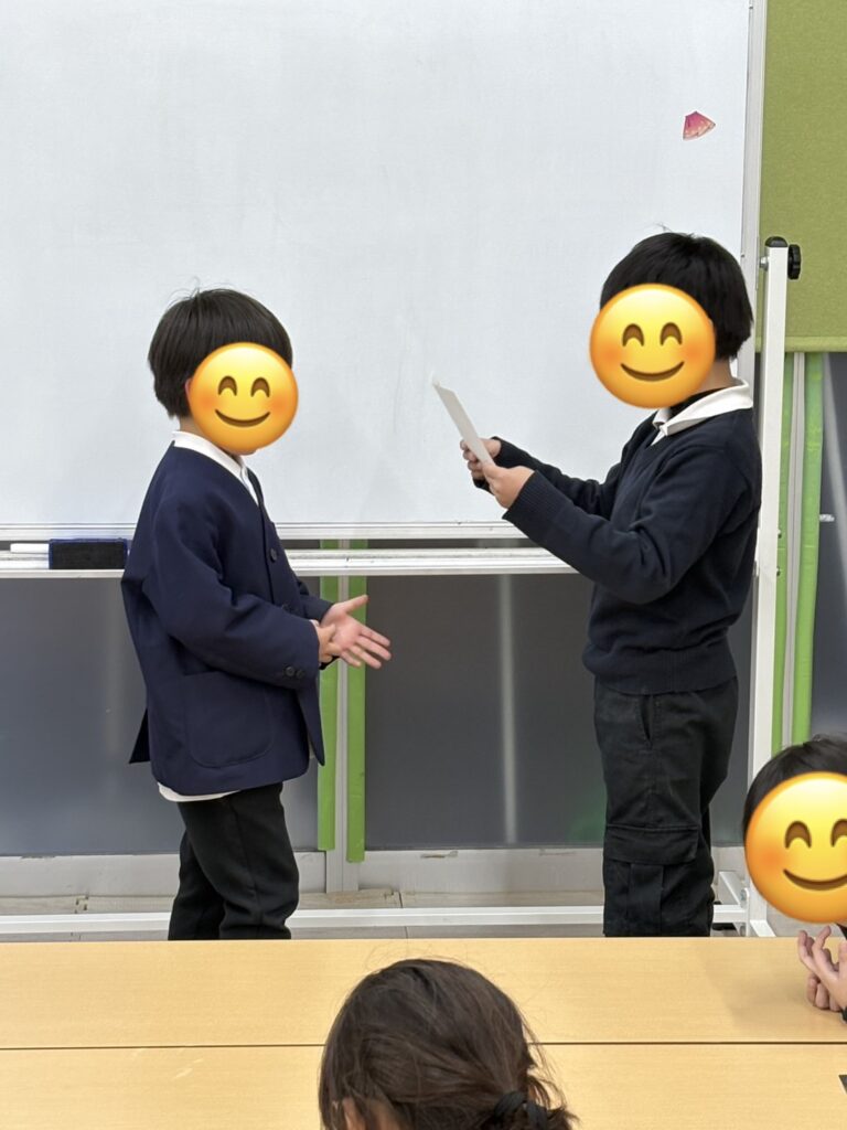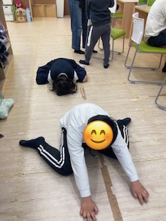 ペアで向き合い、後ろにいる人が取ったポーズを見て、前の人へ言葉で伝える活動を行いました。「右手を上にあげて!」「足を開いて!」など、ブロックの時と同様、相手にわかりやすく伝えます。実際に同じポーズができたときは、「やった!」と嬉しそうな声が聞こえてきましたよ🥰