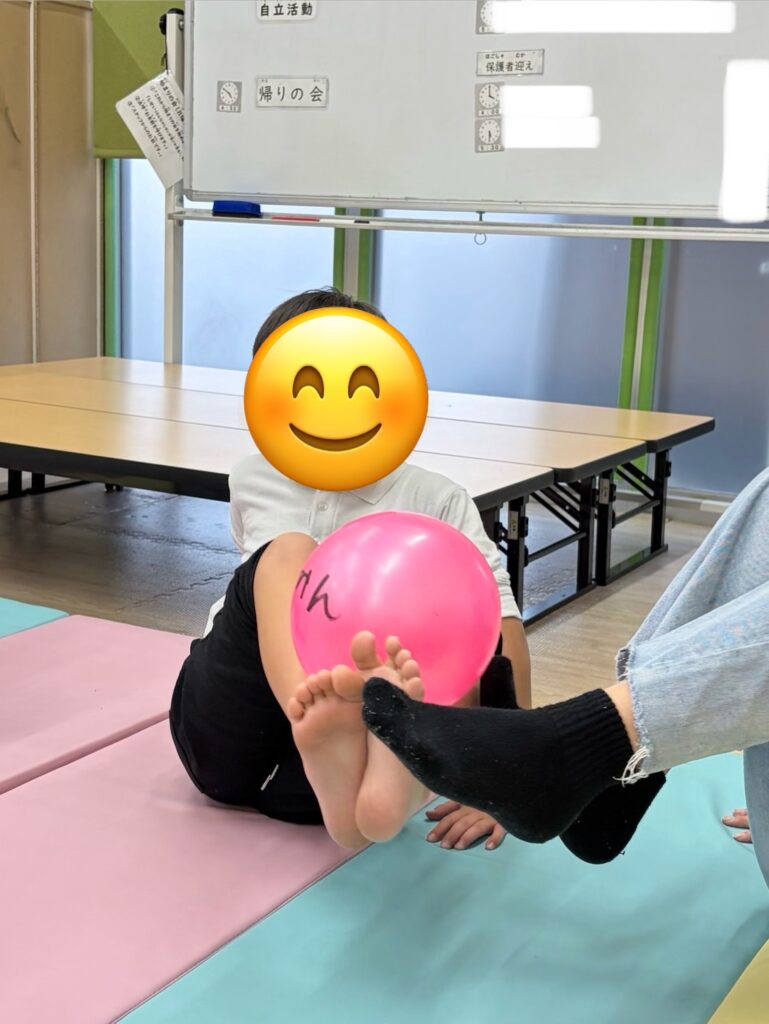 ボールを足に挟んだ状態で隣の人に渡したり、受け取ってボールを落とさないように楽しみました!