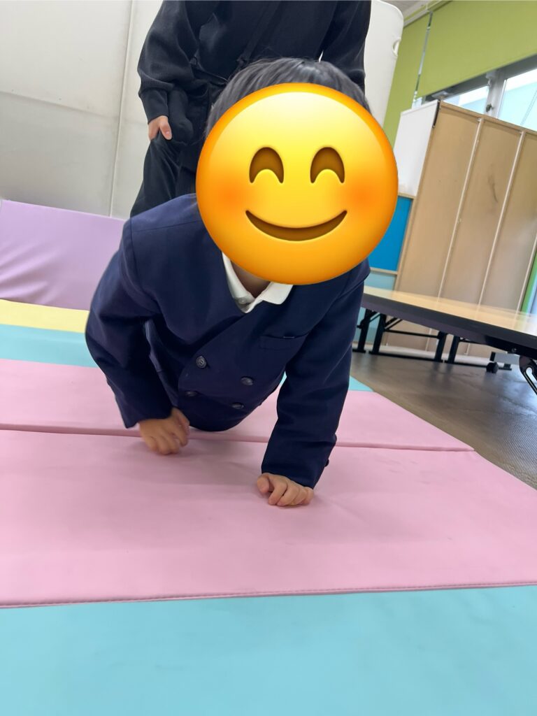 足を支えてもらいながら、両手だけで前に進みます!