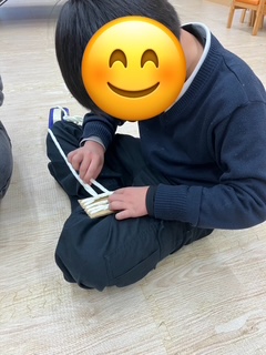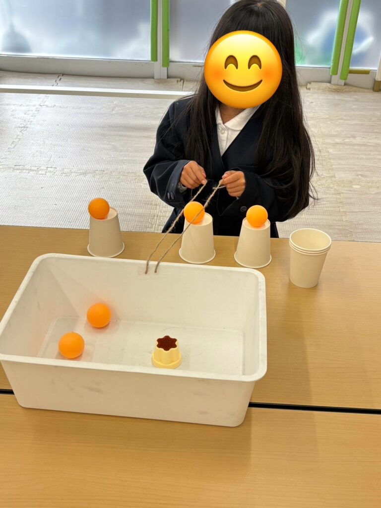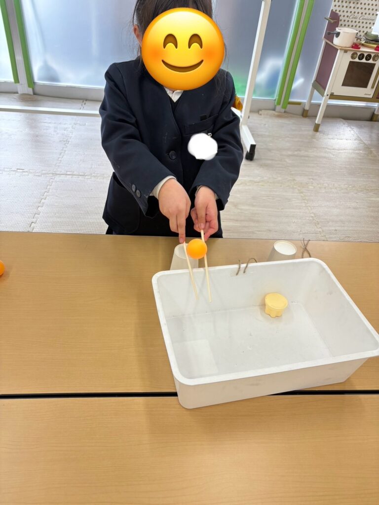 ピンポン玉転がしにも挑戦!毛糸で格子編みも手先を器用に使いながら、集中して編んでいます🧶