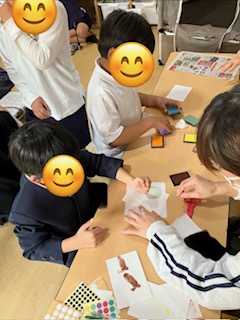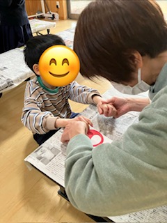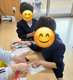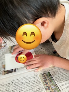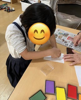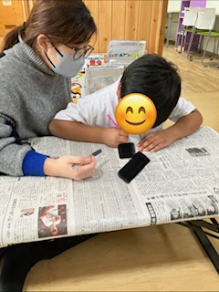 真剣に、自宅の住所を書き込む顔が、みんな凛々しかったです。裏面は、自分の手をスタンプで色づけて、来年の干支である「午」を表現しました。だるまさんの切り絵をデザインしたお友だちもいました✨