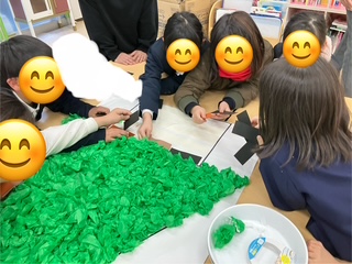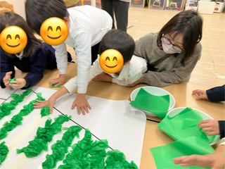 丸めた花紙を模造紙に描いてあるツリーへ貼っていきます!