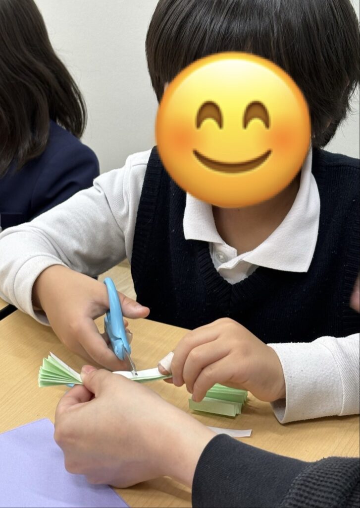 折り紙は一度開けて、じゃばら折りにし、お手本と同じ長さで切ります✂