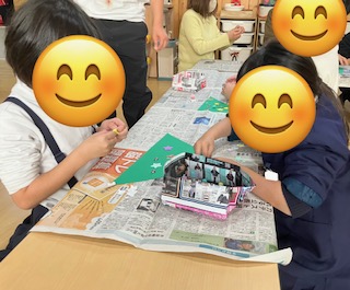 グループに分かれてそれを1つの画用紙に絵を描いたり、シールを貼ったり、モールで何か作って張り付けたり…と協力して作って貰いました!