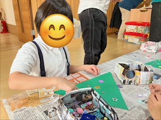真剣な表情でお友だちと話し合いながらどんなツリーにするか考えて作っていましたよ!