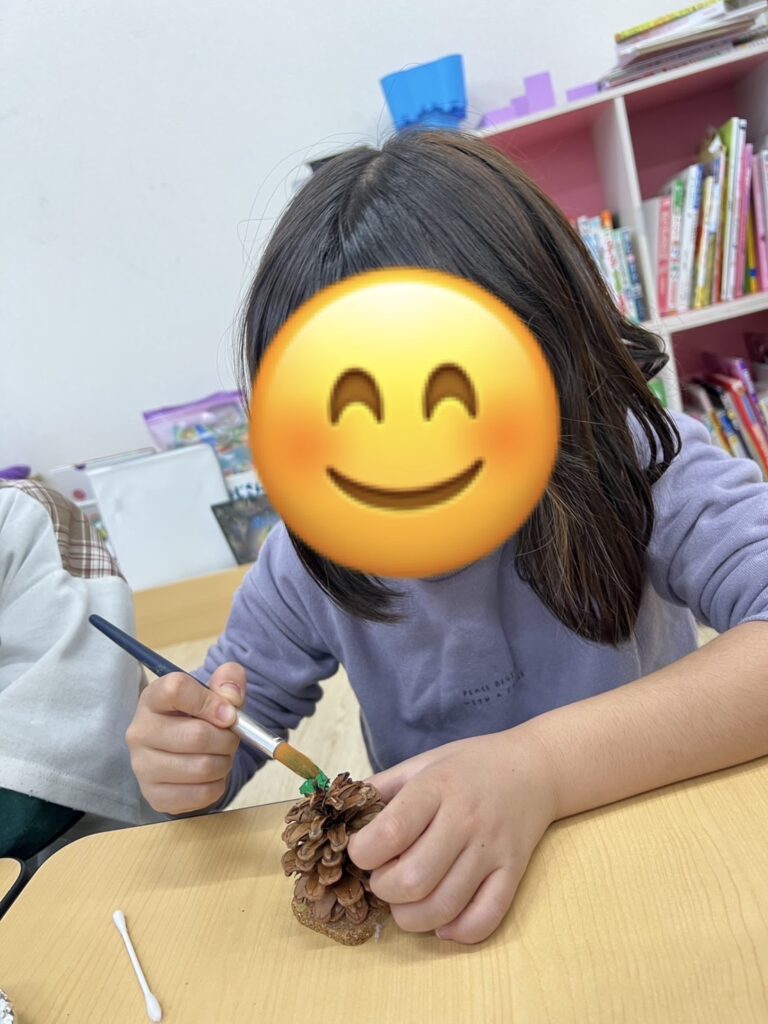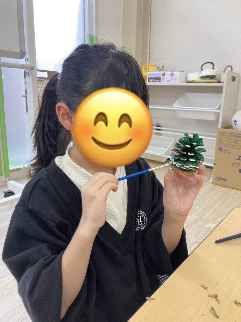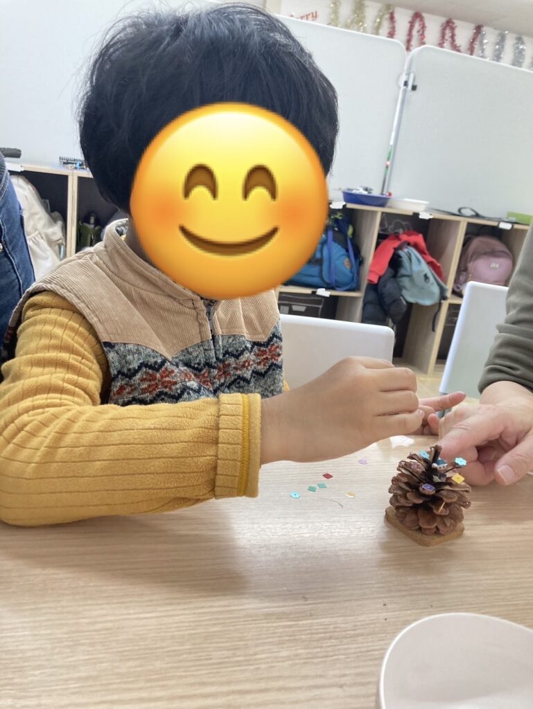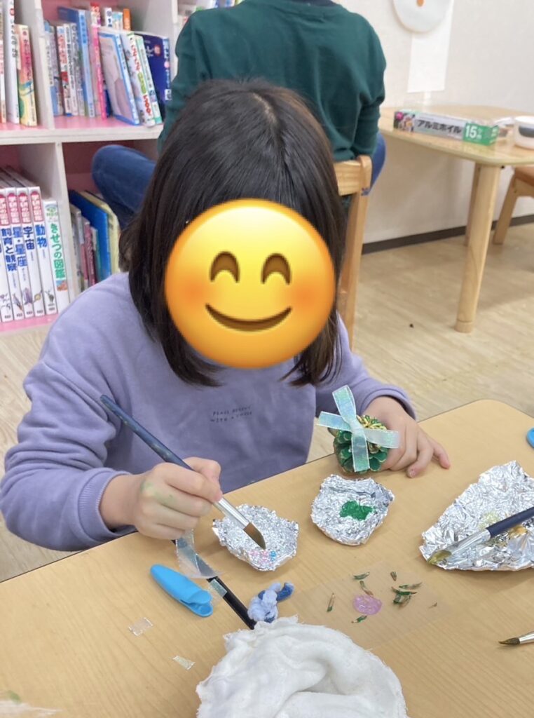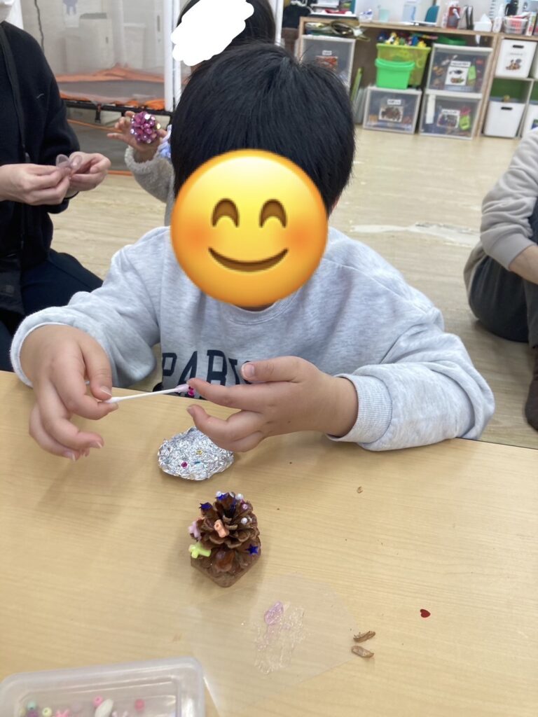 「松ぼっくりをツリーみたいに緑に塗る!」「雪みたいに白く塗るよ❄️」と思い思いにオリジナルツリーを作っていきます😊 可愛いビーズやスパンコール、リボンを付けて完成です♡