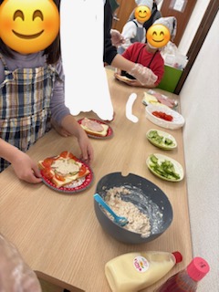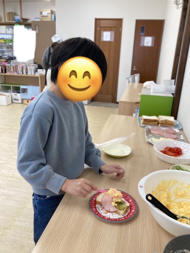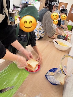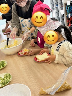 「ハムとチーズ、トマト、きゅうり!」「たまごにツナに〜全部乗せする!」「おかわりでチョコバナナホイップするよ♡」と、友達同士で嬉しそうに話しサンドイッチを作っていきます🥰