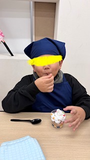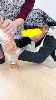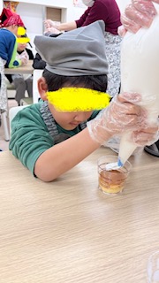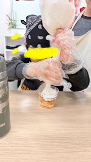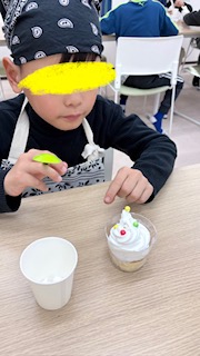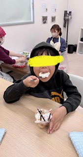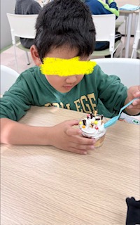お昼からはクリスマスケーキを作りました🎂ケーキの上にホイップクリームをのせ、その上にマーブルチ、ポッキーポッキーで飾りました🎵クリームをたくさんかけて~美味しいケーキにみんなペロリと食べましたよ😋