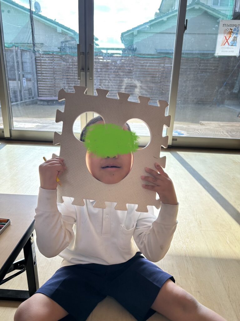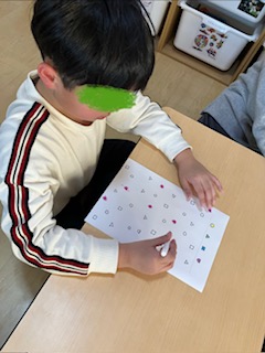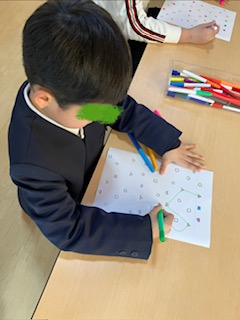 4つの見本と同じ形・色を見つけてぬっていきます。○や△の形を探して上手に色塗りができました👏