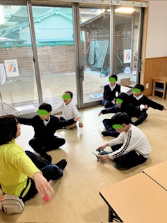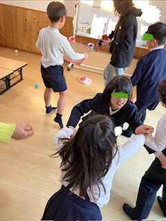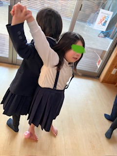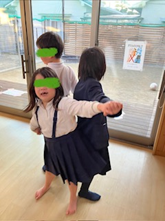 日本に昔から伝わる伝承遊びです。お友だちと歌を歌いながら手をつないで体を大きく動かします。手をつないだまま2人同じ方向にひっくり返り外側を向いて背中合わせになります。繰り返し行い、人数を増やしながら楽しみました💖