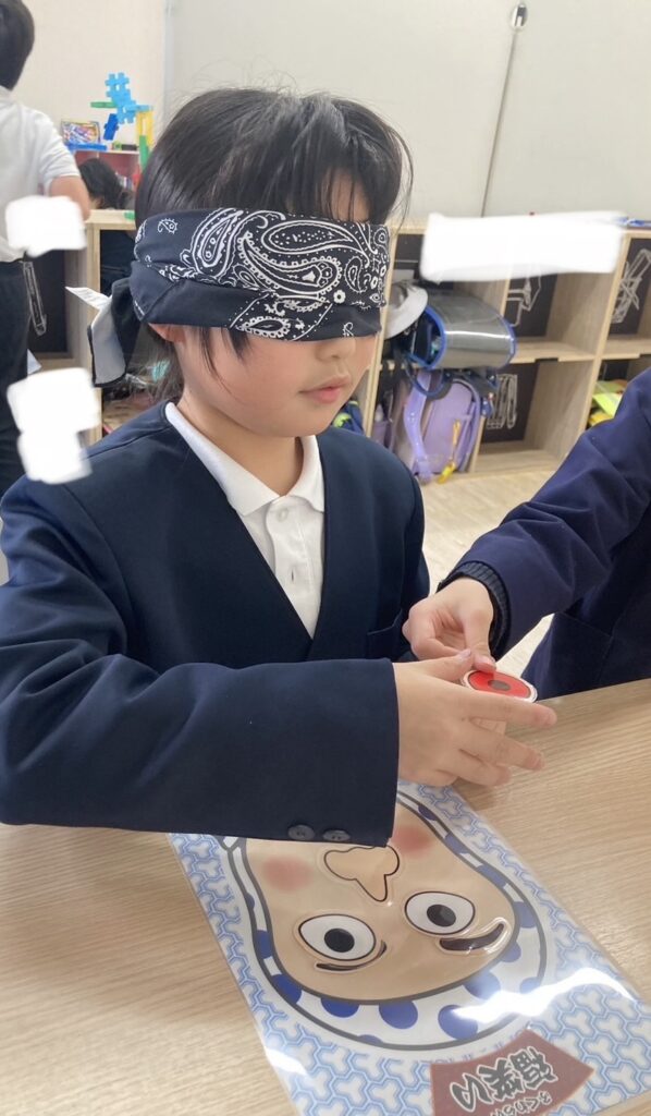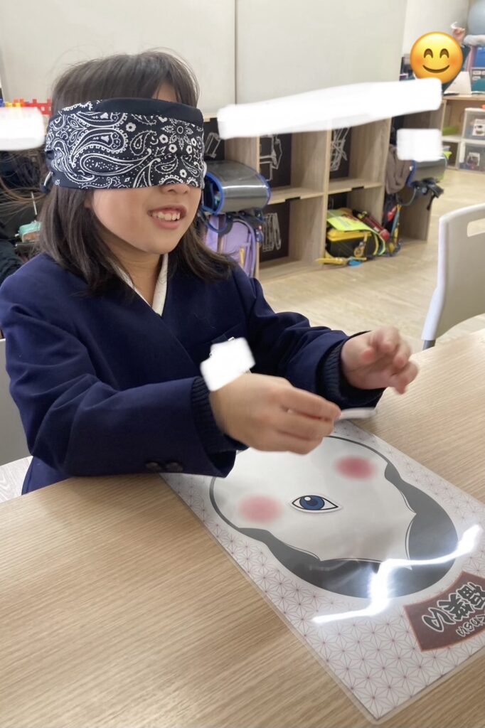 友達がやり進め、どんどん面白い表情になっていくのを見て笑う子、目隠しをとって自分の作った面白い表情に笑う子、目隠ししているとは思えないくらい上手いお顔を作る子・・・。笑顔いっぱいの楽しい活動になりました✨