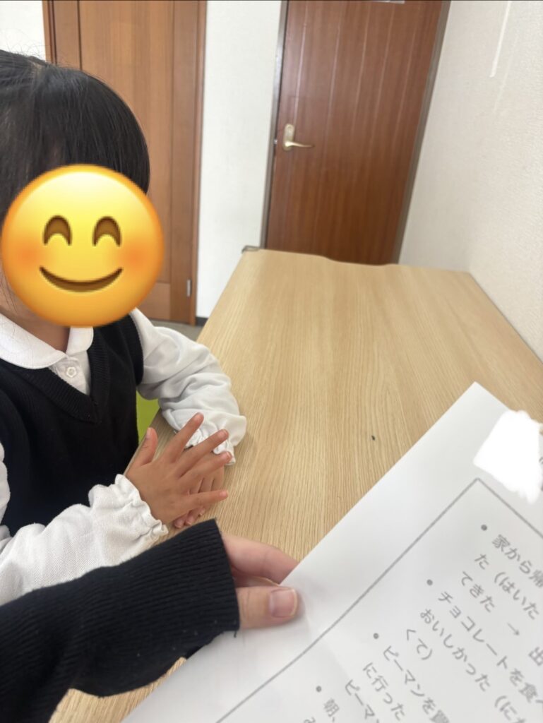 スタッフが読み上げるお話(1文で終わる短いものです)を聞いて、おかしいところ・間違っているところを考えて直してもらいます。耳で聞いた情報を処理する能力を高めることがねらいです。相手の話を最後まで聞くこと、聞いた内容を自分でしっかりと考えて理解することが大切になります。