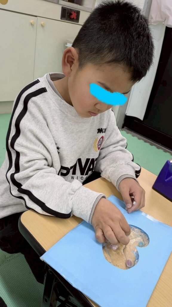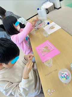 今回は、洗濯糊を使って触感を楽しみ、キラキラのラメや可愛いパーツを入れて視覚も刺激するというものを作りました。